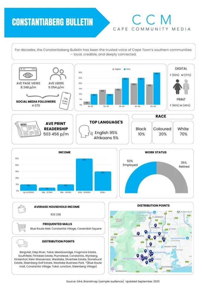 The Constantiaberg Bulletin is a free weekly community newspaper available in print and digital format. It is distributed to 31 850 readers’ homes every Thursday in the Bergvliet, Diep River, Tokai, Meadowridge, Frogmore Estate, Southfield, Flintdale Estate, Plumstead, Constantia, Wynberg, Kirstenhof, Klein Wassenaar, Westlake, Silvertree Estate, Stonehurst Estate, Steenberg Golf Estate and Westlake Business Park areas.