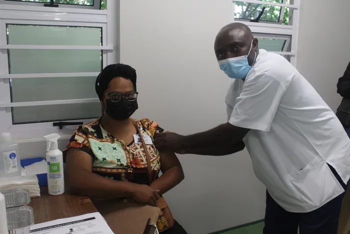 Dr Tasneem Esack of Victoria Hospital being vaccinated at Groote Schuur Hospital,