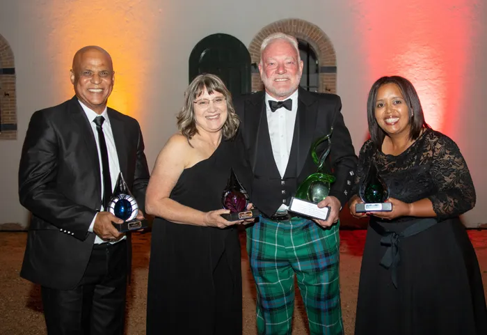 Rydal Jeftha, Wendy Jonker, Ken Forrester, and Dr Erna Blancquaert have received awards for their contributions to the SA wine industry. They were honoured at the Wine Harvest Commemorative Event. Photograph: Daniel Nel Photography