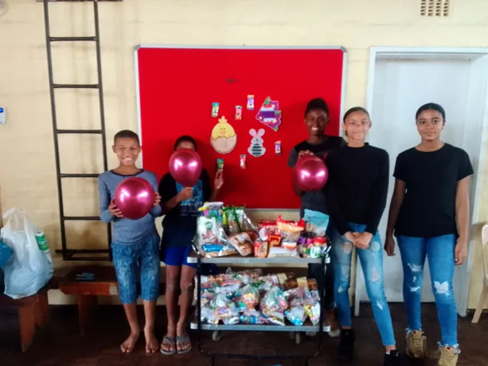 The Naruna Estate Residents’ Association held an Easter egg hunt at 1st Naruna Constantia Scout Group Hall on Friday April 7. Food parcels, hot cross buns and Easter eggs were also handed out to needy residents and the homeless on the day. From left, are Jaden Pivalizza, Jordan Strong, Tia and Nikita Pivalizza and Sasha Amaike with some of the Easter treats. Picture: supplied.