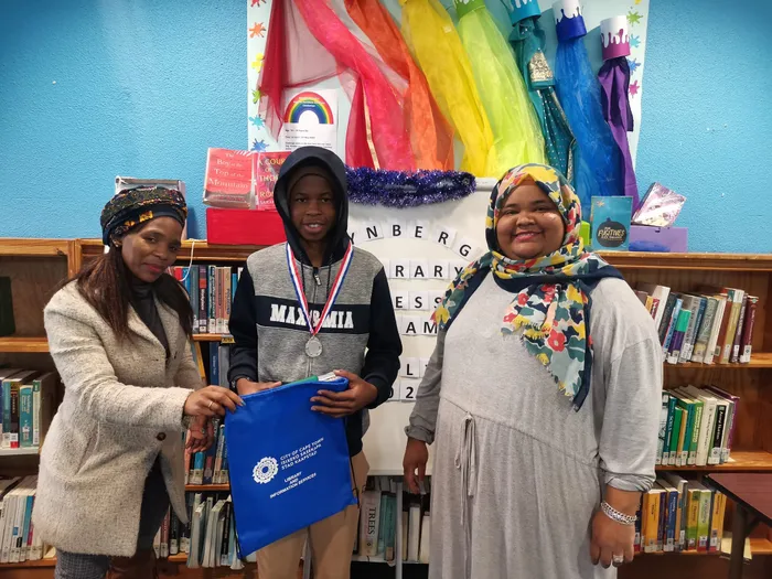 Thando Dhlamini, middle, won first prize in a chess tournament, which was held at the Wynberg library on Friday July 7. With him are librarians Zikhona Vika, left, and Suraya Davids Kasu. Winners received medals, USB sticks, a chess set and dominoes. The final round of the tournament will be held on Thursday October 5. Picture: supplied