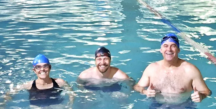 From left are the The Wycliffe Bible Translation South African members, June Dickie, Christoff Kok and Alan Webster who met up in the final week in Johannesburg to finish up the 50km swimming challenge.