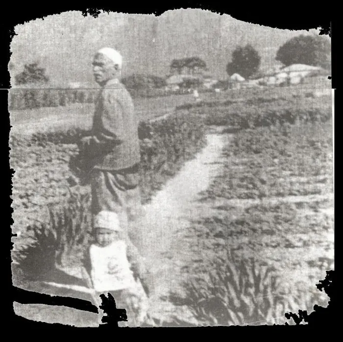Haji Ismael Solomon, right and Ismail on Sillery farm, Constantia circa 1963