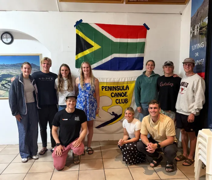 Peninsula Canoe Club members gather for a group photo ahead of their departure for this weekend's 2025 ICF Canoe Ocean Racing World Championships in Durban. Back row, Jade Wilson, Uli Hart, Kira Bester, Melanie van Niekerk, Georgia Singe, Cody Stallard and Matt Coerzer. In front are Nick Notten, Holly Smith, and Kenny Rice. Absent are: Mark Keeling, Reef Funston, Jared Shrimpton and Alayah Krogscheepers.